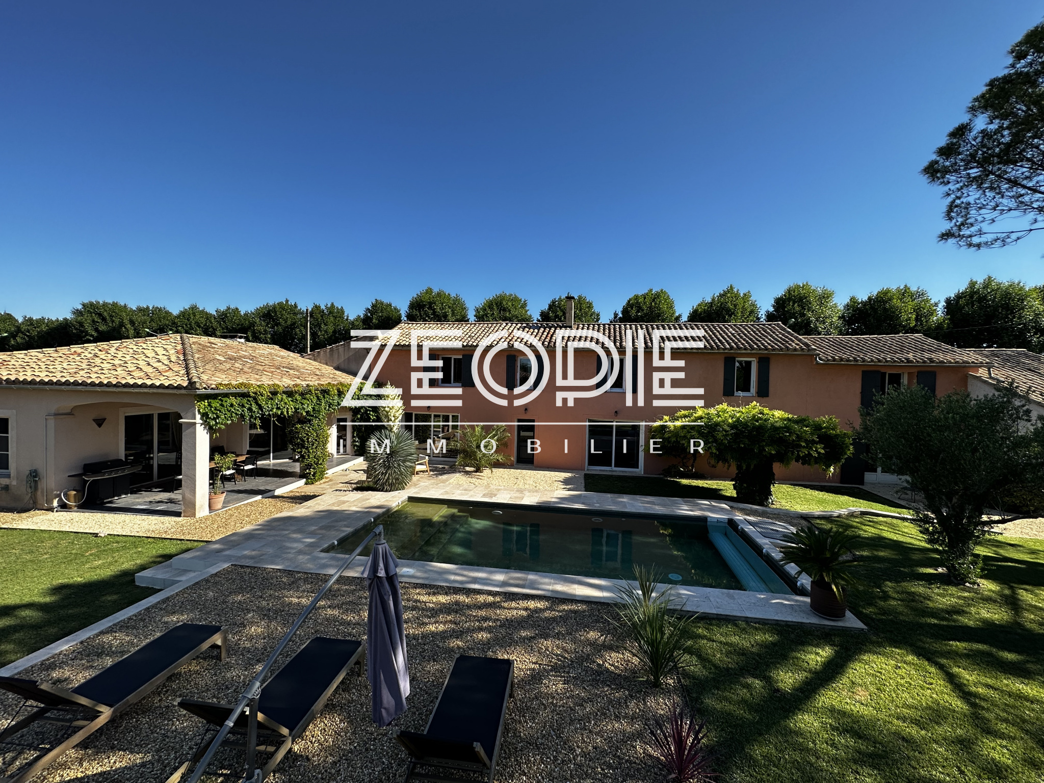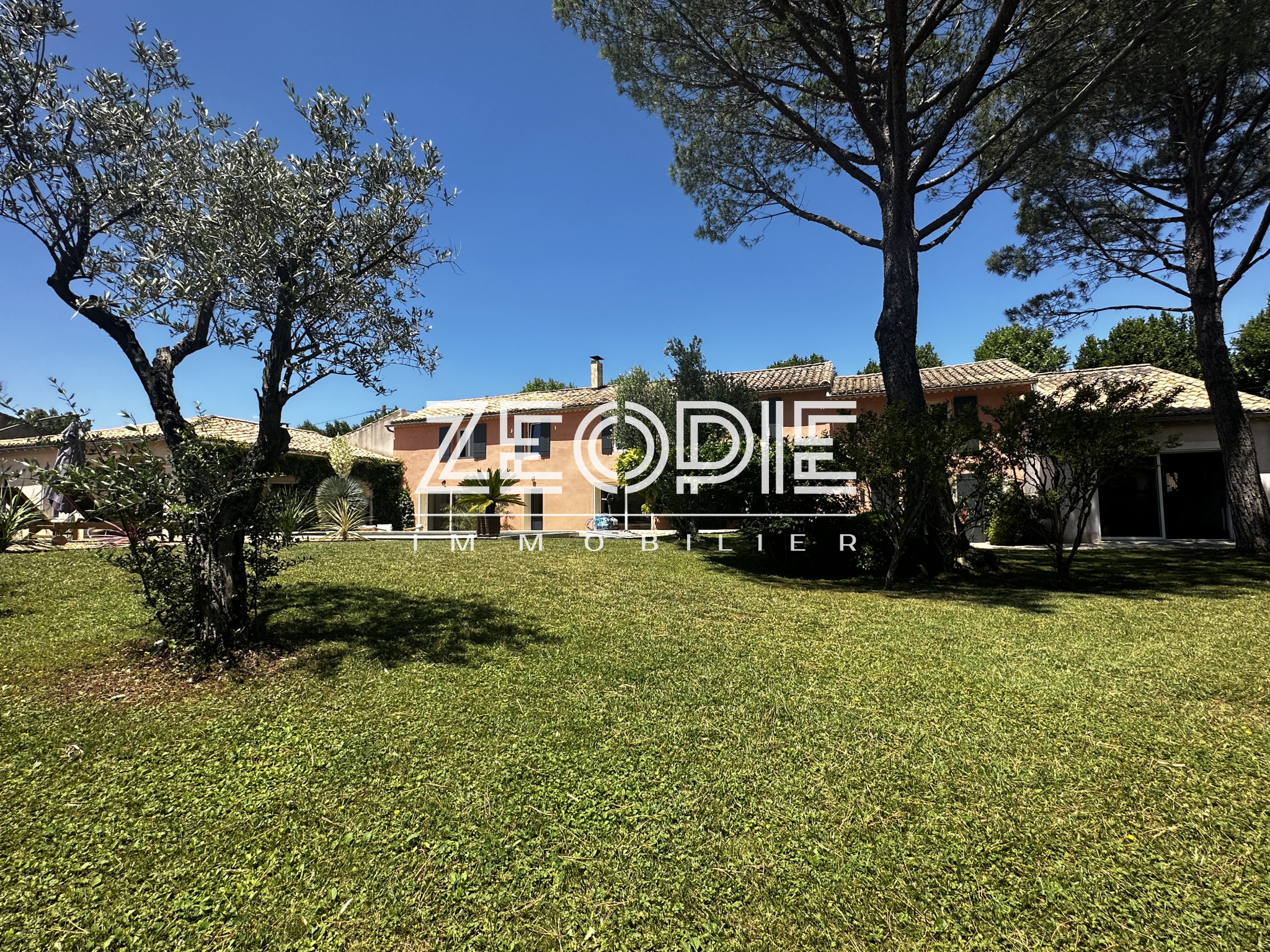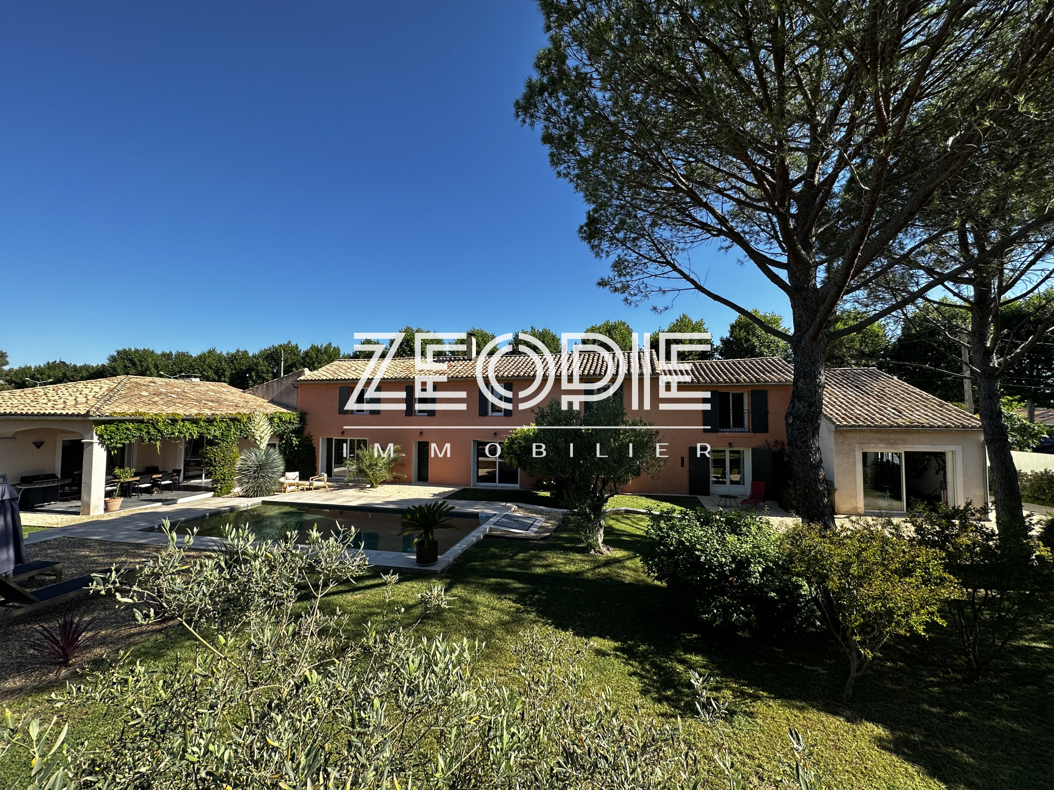 Ce mas ancien non mitoyen élevé d’un étage sur Rez de chaussé est implanté sur un jardin clos et paysage de 2000m2. Situé au calme et sans nuisance malgré sa proximité des commerces et du centre ville, ce mas ancien de 310 m2 habitables environ se compose en rez de chaussé d’un grand hall d’entrée avec placards, d’un salon / Sam de plus de 60m2 avec cheminée en pierre, d’une grande cuisine de 20m2 environ entièrement équipée et rénovée avec 2 arrières cuisine / buanderie pour le stockage et les machines à laver et sèche linge. Ensuite un petit salon / coin TV de 15m2 environ avec cheminée insert panoramique, un bureau de 15m2 et enfin une suite parentale de 25m2 environ avec placards, salle d’eau et WC privatif. Accès direct sur le jardin par porte fenêtre. A l’étage vous accéderez par un escalier central à 2 chambres sur votre droite, une de 16 m2 et l’autre de 25m2 environ. Ensuite de l’autre côté à l’étage 1 première chambre de 16m2 environ, une grande salle de bain de 13m2 avec double vasque, baignoire et douche à l’italienne. Enfin une 4eme chambre avec placards de 18m2 environ, un dressing aménagé de 10m2 et un WC séparé. La maison bénéficie de 3 garages, un premier de 40m2 environ avec 2 portes sectionnelles automatiques pour garer 2 véhicules, une cave à vin et un espace de rangement supplémentaire de 15m2 sous toiture. De l’autre côté de la maison un garage de 25m2 environ avec mezzanine en bois à l’étage de 15m2 environ. La maison a été rénovée très récemment, pour votre confort vous bénéficierez du double vitrage PVC KparK, d’un système de chauffage central par pompe à chaleur DAIKIN ( au sol au Rez de chaussé et radiateur alu à l’étage) + une climatisation réversible MITSUBISHI dans toute la propriété. Façades rénovées cette année, gouttières en zinc, toiture complètement rénovée également, tout à l’égout… Matériaux de qualités ( carrellage terre cuite, parquet, poutres… ) exposition plein sud, terrain de boules, arrosage automatique, forage, piscine traditionnelle chauffée de 9 mètres x 4, portail automatique, une terrasse couverte de 25m2 et une autre non couverte de 20m2. Parc arboré et clos de 2000m2 au calme et sans vis, possibilités d’agrandissements. . Possibilité d’achat meublé ou partiellement meublé.
